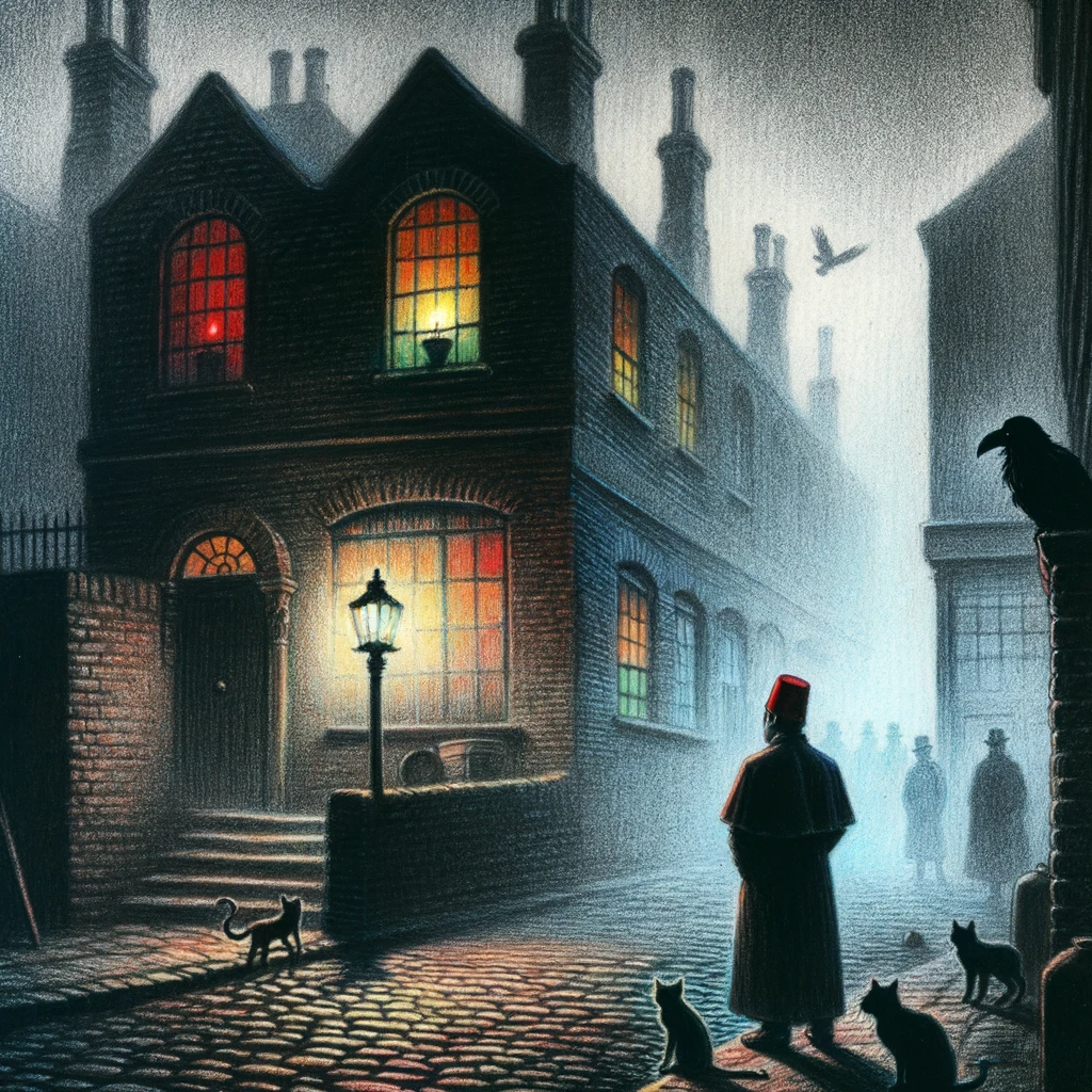 The night was dark and foggy as Professor Julius Smith’s urgent messages summoned Madame Zorba, Miss Viola Suttcliffe, Mr. Clinton Lake, and Herr Per Oskarson to the seedy Whitechapel district of London. Led by the professor, the group made their way to a run-down lodging house, where they met the elderly Mrs. Agnes Grim. She directed them upstairs, where a ghastly sight awaited in a cramped garret room.