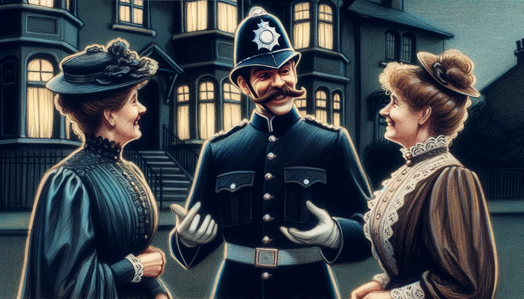 Outside Devore’s small house, a ruddy-cheeked Bobby with a thick mustache stood guard, stalwart in his duty to secure the crime scene. Mr. Lake attempted to glean information by questioning a passing bread delivery boy, but the lad knew little more than hearsay. Meanwhile, Miss Sutcliffe approached the officer directly, laying on her gentlewomanly charms. She engaged him in friendly chatter, taking keen interest in his work and raging against the decline of manners in modern London. Playing up their roles as proper English ladies of a certain age, Miss Sutcliffe indicated she and Madam Zorba were simply beside themselves to see such violence befall their good neighborhood. Might the gracious officer allow two respected women, so invested in the community’s safety, to glimpse the scene, if only to settle their fluttering nerves? She assured their discretion, flashing the charming smile that so often granted her entry to London’s finest social clubs and art salons. And so the Bobby relented, unable to refuse the pleas of such upstanding ladies.