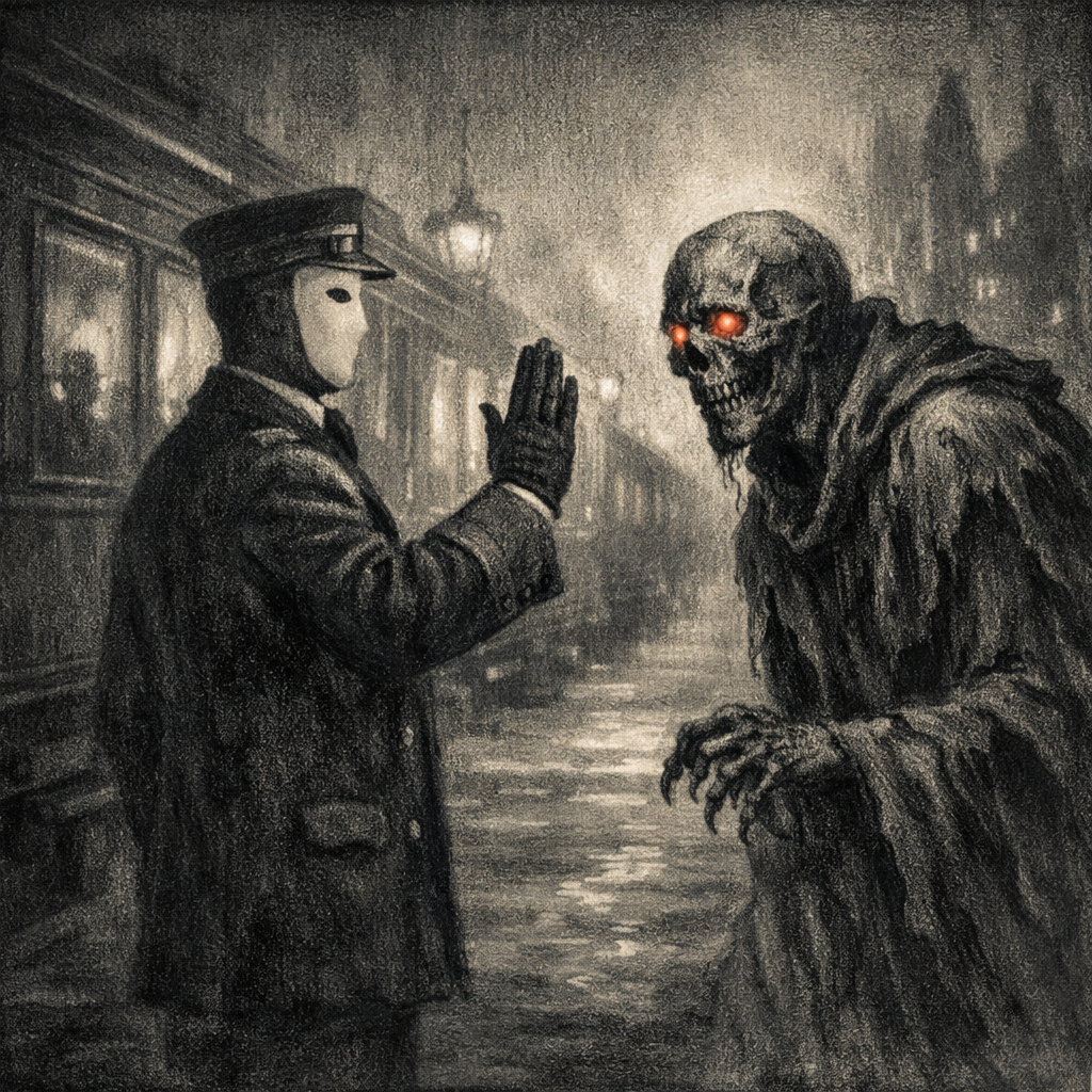 What followed was not a confrontation of strength, but of authority. The conductor stood firm not by his own power, but by invoking something greater—something that governed the train itself. Nodens. The name carried weight, enough to halt the creature where force might not have sufficed. For all its menace, it was not beyond the reach of that rule.